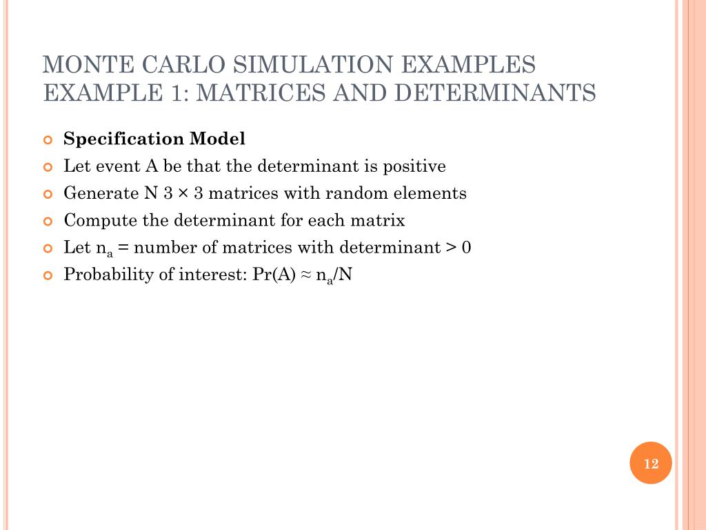 MONTE CARLO SIMULATION EXAMPLESEXAMPLE 1: MATRICES AND DETERMINANTS • Specification Model • Let event A be that the determinant is positive • Generate N 3 × 3 matrices with random elements • Compute the determinant for each matrix • Let na = number of matrices with determinant > 0 • Probability of interest: Pr(A) ≈ na/N