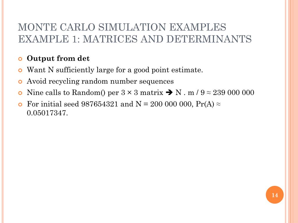 MONTE CARLO SIMULATION EXAMPLESEXAMPLE 1: MATRICES AND DETERMINANTS • Output from det • Want N sufficiently large for a good point estimate. • Avoid recycling random number sequences • Nine calls to Random() per 3 × 3 matrix N . m / 9 ≈ 239 000 000 • For initial seed 987654321 and N = 200 000 000, Pr(A) ≈ 0.05017347.