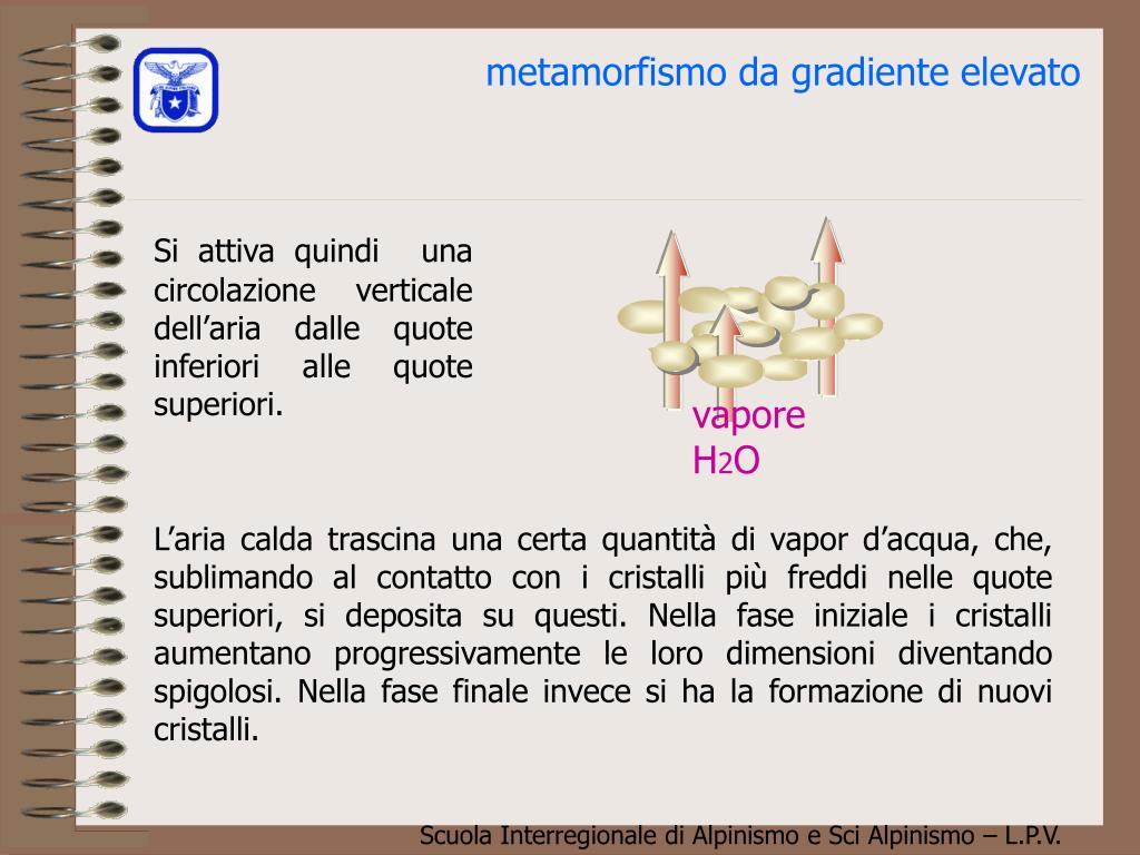 metamorfismo da gradiente elevato vapore H2O Si attiva quindi una circolazione verticale dell’aria dalle quote inferiori alle quote superiori. L’aria calda trascina una certa quantità di vapor d’acqua, che, sublimando al contatto con i cristalli più freddi nelle quote superiori, si deposita su questi. Nella fase iniziale i cristalli aumentano progressivamente le loro dimensioni diventando spigolosi. Nella fase finale invece si ha la formazione di nuovi cristalli.