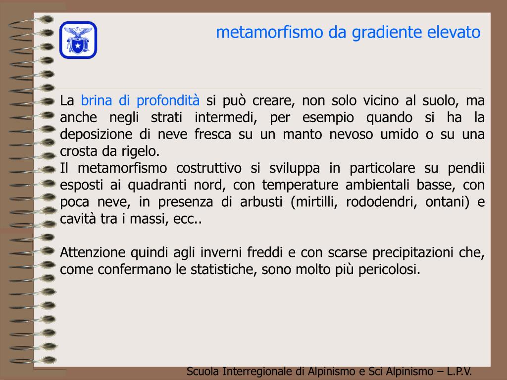 metamorfismo da gradiente elevato La brina di profondità si può creare, non solo vicino al suolo, ma anche negli strati intermedi, per esempio quando si ha la deposizione di neve fresca su un manto nevoso umido o su una crosta da rigelo. Il metamorfismo costruttivo si sviluppa in particolare su pendii esposti ai quadranti nord, con temperature ambientali basse, con poca neve, in presenza di arbusti (mirtilli, rododendri, ontani) e cavità tra i massi, ecc.. Attenzione quindi agli inverni freddi e con scarse precipitazioni che, come confermano le statistiche, sono molto più pericolosi.
