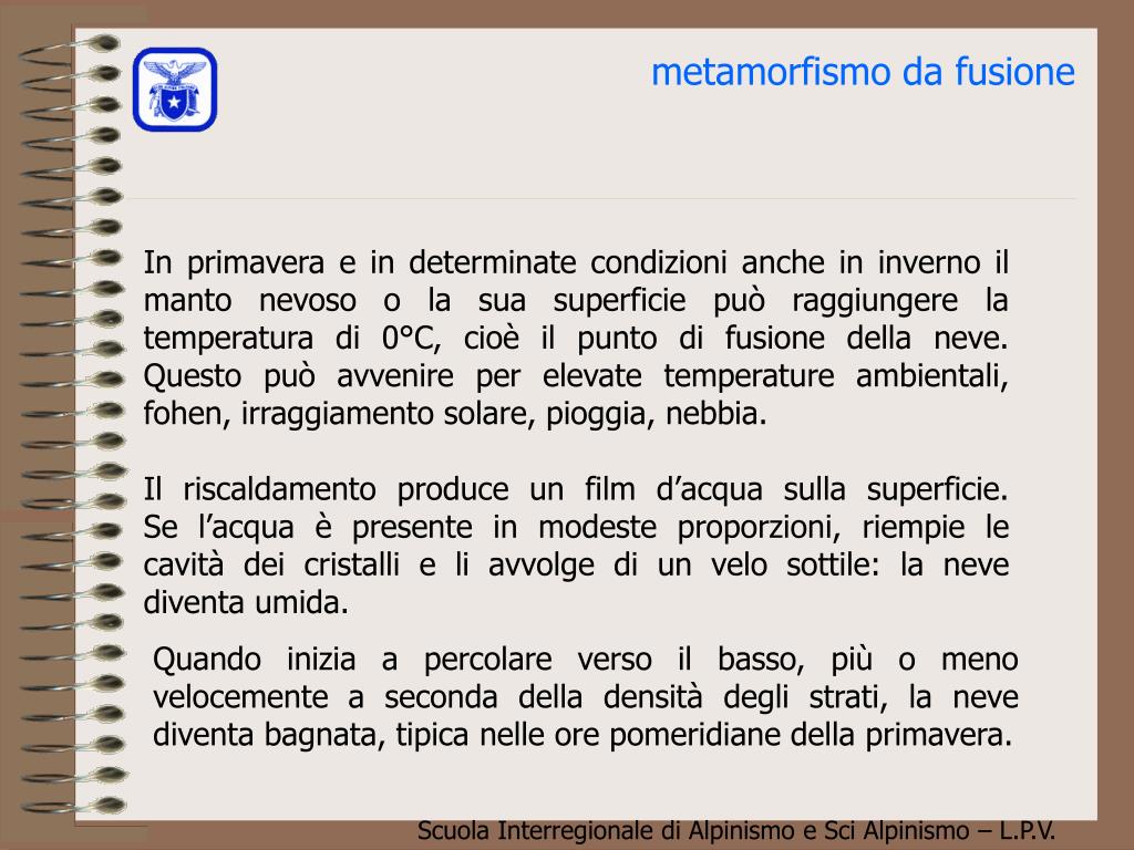 metamorfismo da fusione In primavera e in determinate condizioni anche in inverno il manto nevoso o la sua superficie può raggiungere la temperatura di 0°C, cioè il punto di fusione della neve. Questo può avvenire per elevate temperature ambientali, fohen, irraggiamento solare, pioggia, nebbia. Il riscaldamento produce un film d’acqua sulla superficie.Se l’acqua è presente in modeste proporzioni, riempie le cavità dei cristalli e li avvolge di un velo sottile: la neve diventa umida. Quando inizia a percolare verso il basso, più o meno velocemente a seconda della densità degli strati, la neve diventa bagnata, tipica nelle ore pomeridiane della primavera.