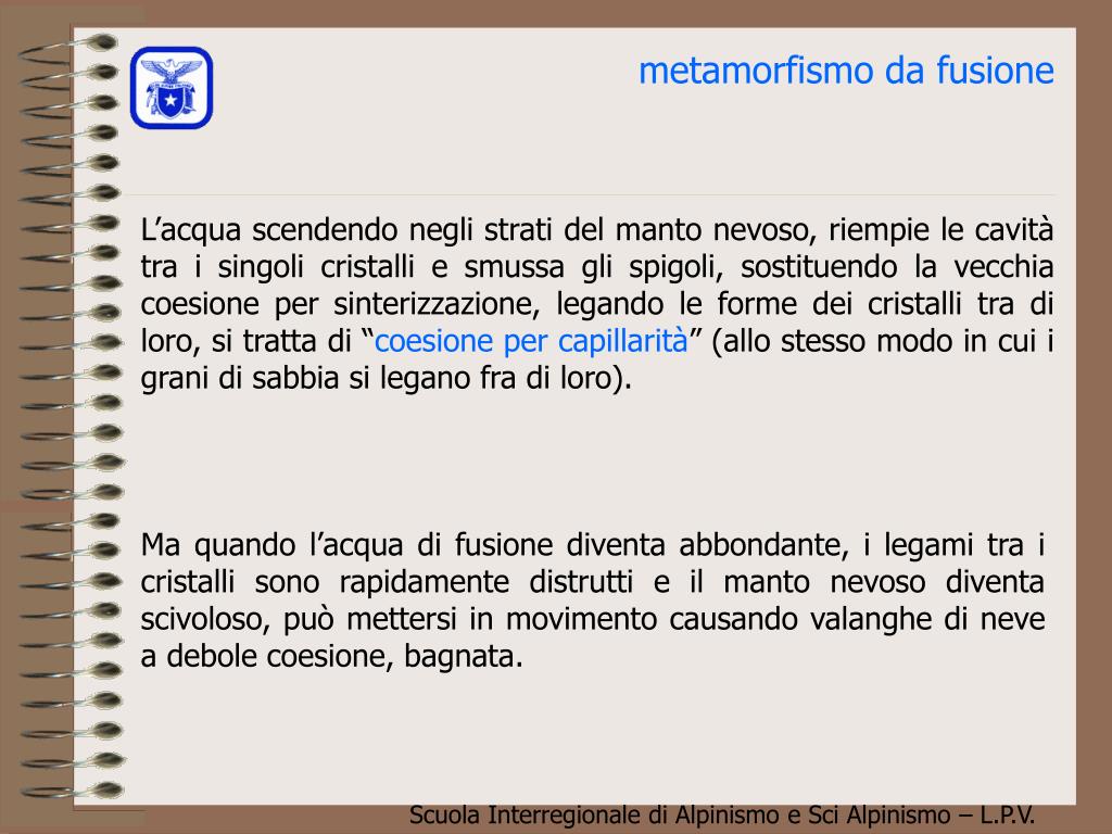 metamorfismo da fusione L’acqua scendendo negli strati del manto nevoso, riempie le cavità tra i singoli cristalli e smussa gli spigoli, sostituendo la vecchia coesione per sinterizzazione, legando le forme dei cristalli tra di loro, si tratta di “coesione per capillarità” (allo stesso modo in cui i grani di sabbia si legano fra di loro). Ma quando l’acqua di fusione diventa abbondante, i legami tra i cristalli sono rapidamente distrutti e il manto nevoso diventa scivoloso, può mettersi in movimento causando valanghe di neve a debole coesione, bagnata.