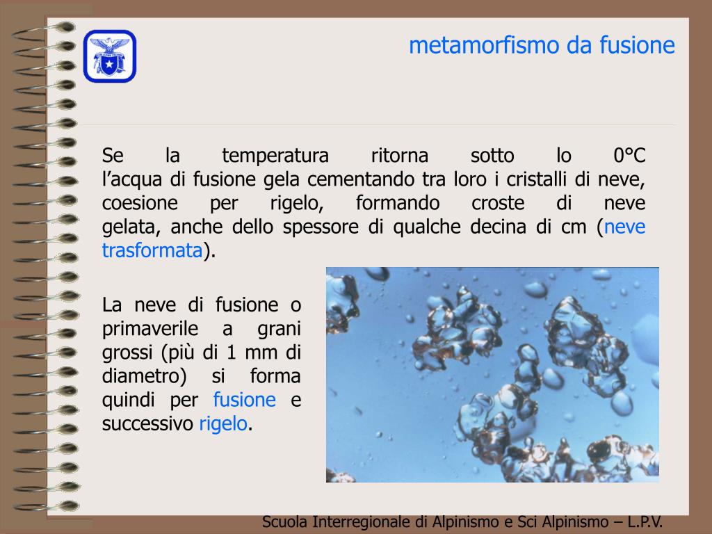 metamorfismo da gradiente debole (isotermia) Il metamorfismo per gradiente debole (isotermia) trasforma i cristalli di neve fresca in neve vecchia granulosa, provocando l’assestamento e il consolidamento dello strato nevoso. Con il tempo mite questo processo richiede solo qualche giorno, mentre con il freddo intenso può durare settimane.