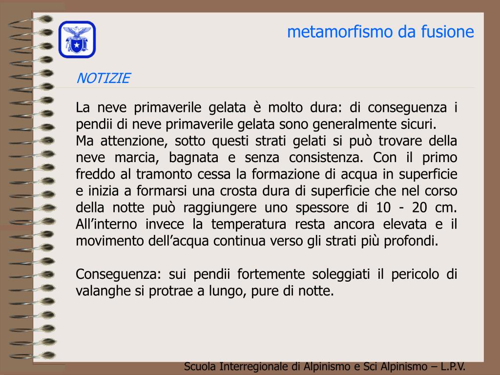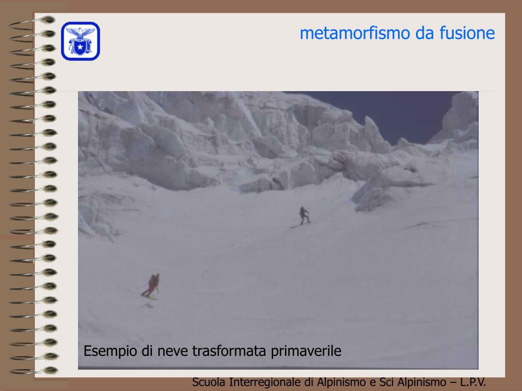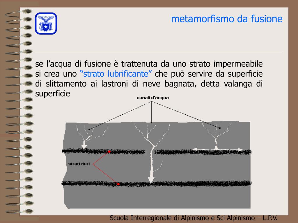 metamorfismo da fusione se l’acqua di fusione è trattenuta da uno strato impermeabile si crea uno “strato lubrificante” che può servire da superficie di slittamento ai lastroni di neve bagnata, detta valanga di superficie