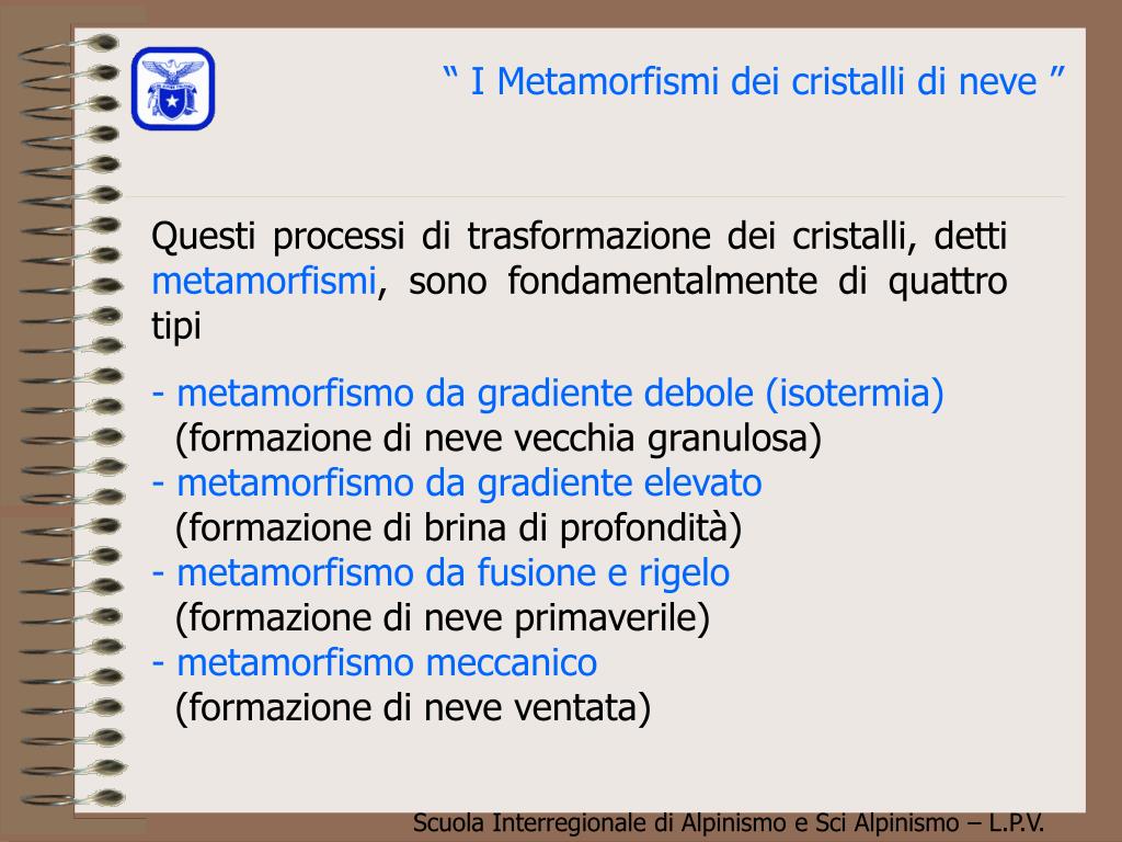“ I Metamorfismi dei cristalli di neve ” Questi processi di trasformazione dei cristalli, detti metamorfismi, sono fondamentalmente di quattro tipi - metamorfismo da gradiente debole (isotermia) (formazione di neve vecchia granulosa) - metamorfismo da gradiente elevato (formazione di brina di profondità)- metamorfismo da fusione e rigelo (formazione di neve primaverile) - metamorfismo meccanico (formazione di neve ventata)