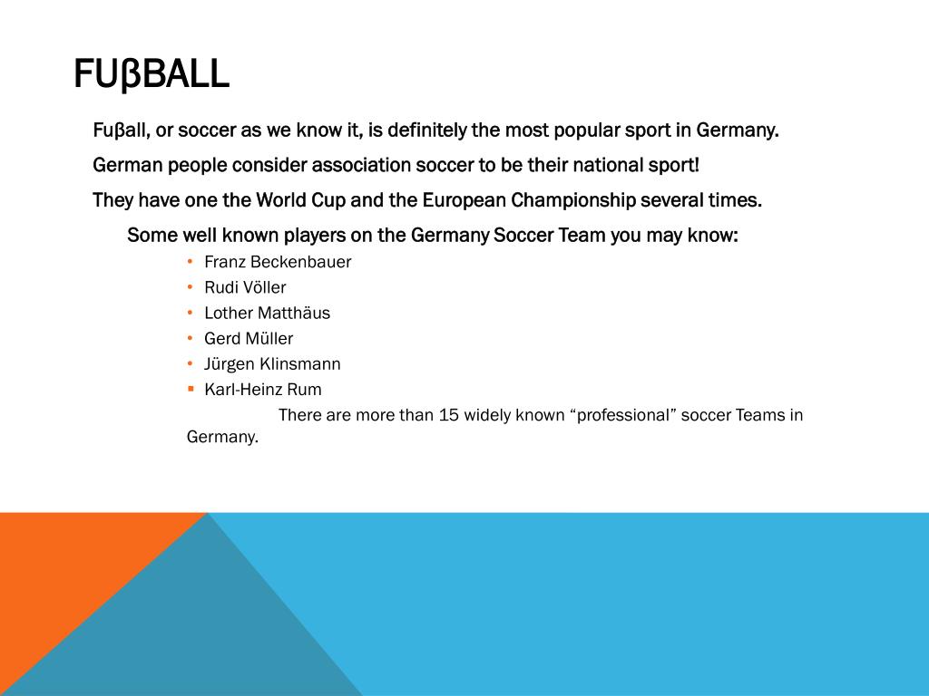Sports in Germany!. FUβBALL. Fuβall, or soccer as we know it, is definitely the most popular sport in Germany. German people consider association soccer to be their national sport! They have one the World Cup and the European Championship several times.