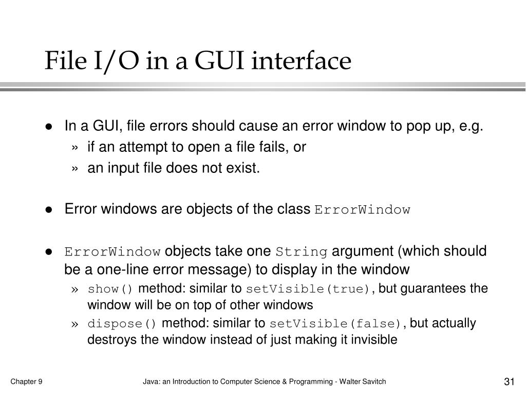 Example:GUI error windows for file I/O buildFile method(excerpt from Display 9.15/page 501): method call to read file name from keyboard attempt to open the file for output: may throw IOException start catch block for IOException create an error window with an error message stating the file could not be created show method: similar to setVisible(true), but guarantees the window will be on top of other windows 32 Chapter 9 Java: an Introduction to Computer Science & Programming - Walter Savitch