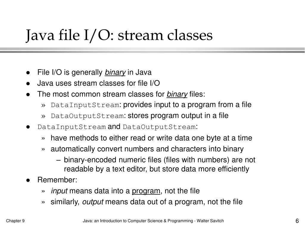 Java file I/O: stream classes • File I/O is generally binary in Java • Java uses stream classes for file I/O • The most common stream classes for binary files: • DataInputStream: provides input to a program from a file • DataOutputStream: stores program output in a file • DataInputStream and DataOutputStream: • have methods to either read or write data one byte at a time • automatically convert numbers and characters into binary • binary-encoded numeric files (files with numbers) are not readable by a text editor, but store data more efficiently • Remember: • input means data into a program, not the file • similarly, output means data out of a program, not the file