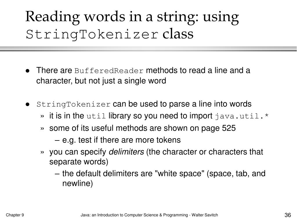 Reading words in a string: usingStringTokenizer class • There are BufferedReader methods to read a line and a character, but not just a single word • StringTokenizer can be used to parse a line into words • it is in the util library so you need to import java.util.* • some of its useful methods are shown on page 525 • e.g. test if there are more tokens • you can specify delimiters (the character or characters that separate words) • the default delimiters are "white space" (space, tab, and newline)