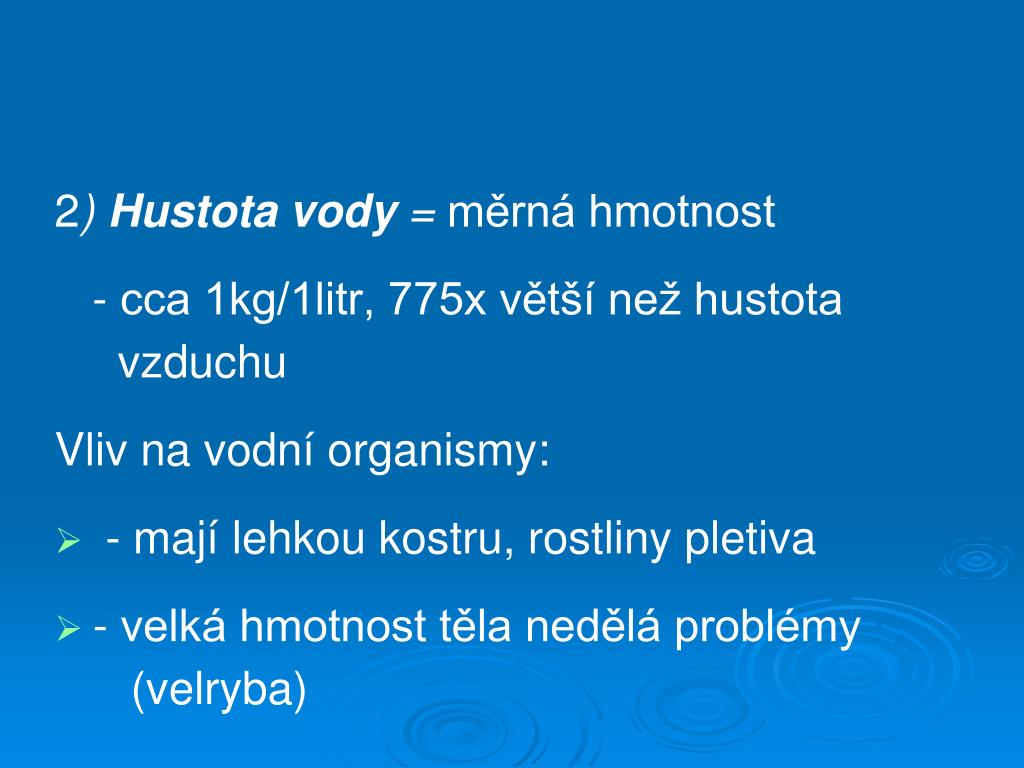 2) Hustota vody = měrná hmotnost - cca 1kg/1litr, 775x větší než hustota vzduchu Vliv na vodní organismy: • - mají lehkou kostru, rostliny pletiva • - velká hmotnost těla nedělá problémy (velryba)