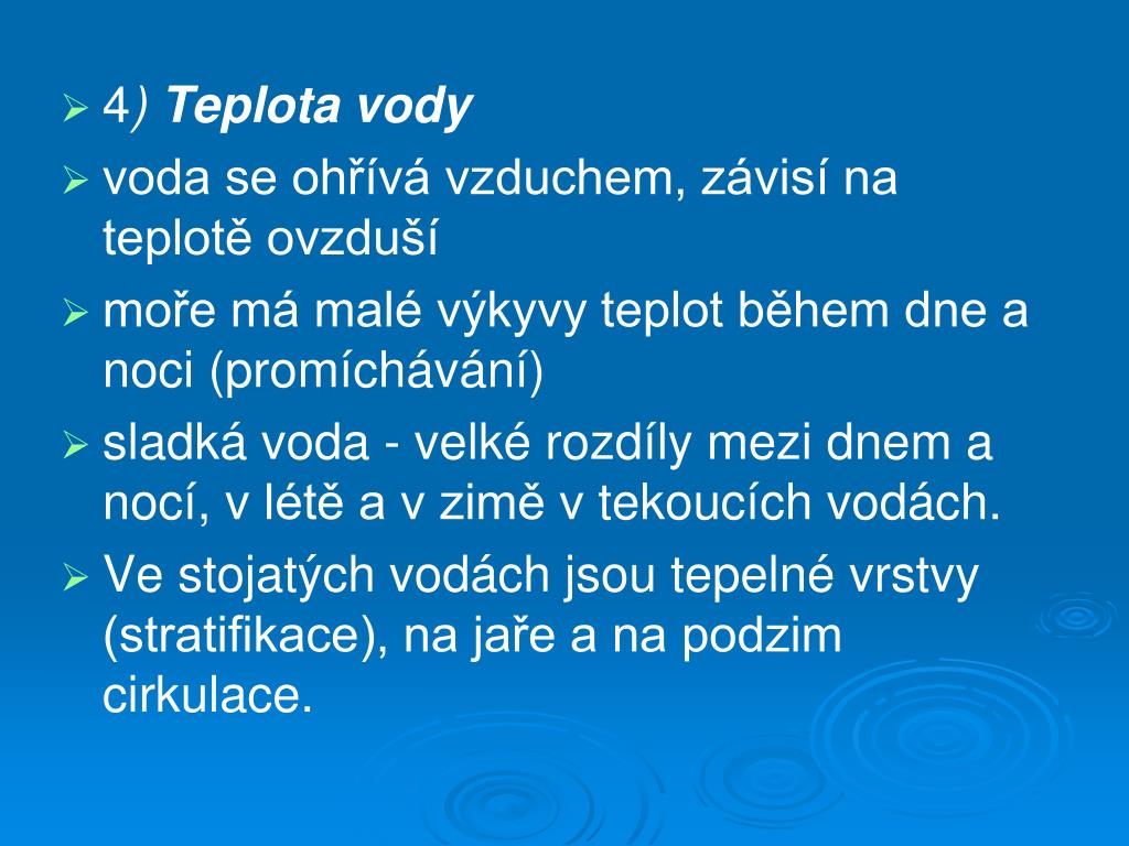 4) Teplota vody • voda se ohřívá vzduchem, závisí na teplotě ovzduší • moře má malé výkyvy teplot během dne a noci (promíchávání) • sladká voda - velké rozdíly mezi dnem a nocí, v létě a v zimě v tekoucích vodách. • Ve stojatých vodách jsou tepelné vrstvy (stratifikace), na jaře a na podzim cirkulace.