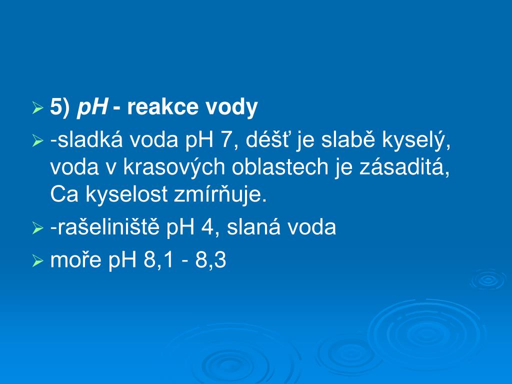5) pH - reakce vody • -sladká voda pH 7, déšť je slabě kyselý, voda v krasových oblastech je zásaditá, Ca kyselost zmírňuje. • -rašeliniště pH 4, slaná voda • moře pH 8,1 - 8,3