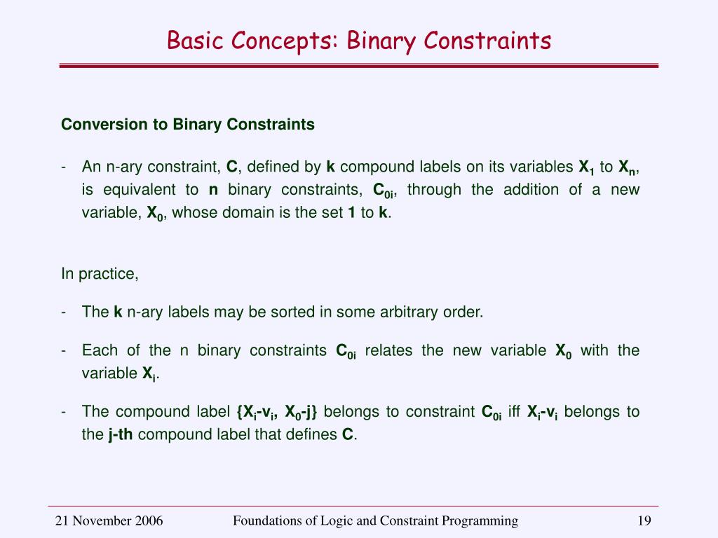 Basic Concepts: Binary Constraints Conversion to Binary Constraints • An n-ary constraint, C, defined by k compound labels on its variables X1to Xn, is equivalent to n binary constraints, C0i, through the addition of a new variable, X0, whose domain is the set 1 to k. In practice, • The k n-ary labels may be sorted in some arbitrary order. • Each of the n binary constraints C0irelates the new variable X0 with the variable Xi. • The compound label {Xi-vi, X0-j} belongs to constraint C0i iff Xi-vi belongs to the j-th compound label that defines C. Foundations of Logic and Constraint Programming