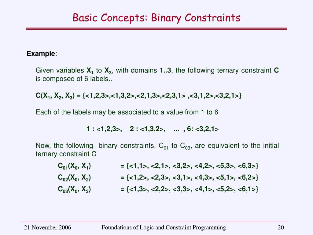 Basic Concepts: Binary Constraints Example: Given variables X1to X3, with domains 1..3, the following ternary constraint C is composed of 6 labels.. C(X1, X2, X3) = {<1,2,3>,<1,3,2>,<2,1,3>,<2,3,1> ,<3,1,2>,<3,2,1>} Each of the labels may be associated to a value from 1 to 6 1 : <1,2,3>, 2 : <1,3,2>, ... , 6: <3,2,1> Now, the following binary constraints, C01 to C03, are equivalent to the initial ternary constraint C C01(X0, X1) = {<1,1>, <2,1>, <3,2>, <4,2>, <5,3>, <6,3>} C02(X0, X2) = {<1,2>, <2,3>, <3,1>, <4,3>, <5,1>, <6,2>} C03(X0, X3) = {<1,3>, <2,2>, <3,3>, <4,1>, <5,2>, <6,1>} Foundations of Logic and Constraint Programming