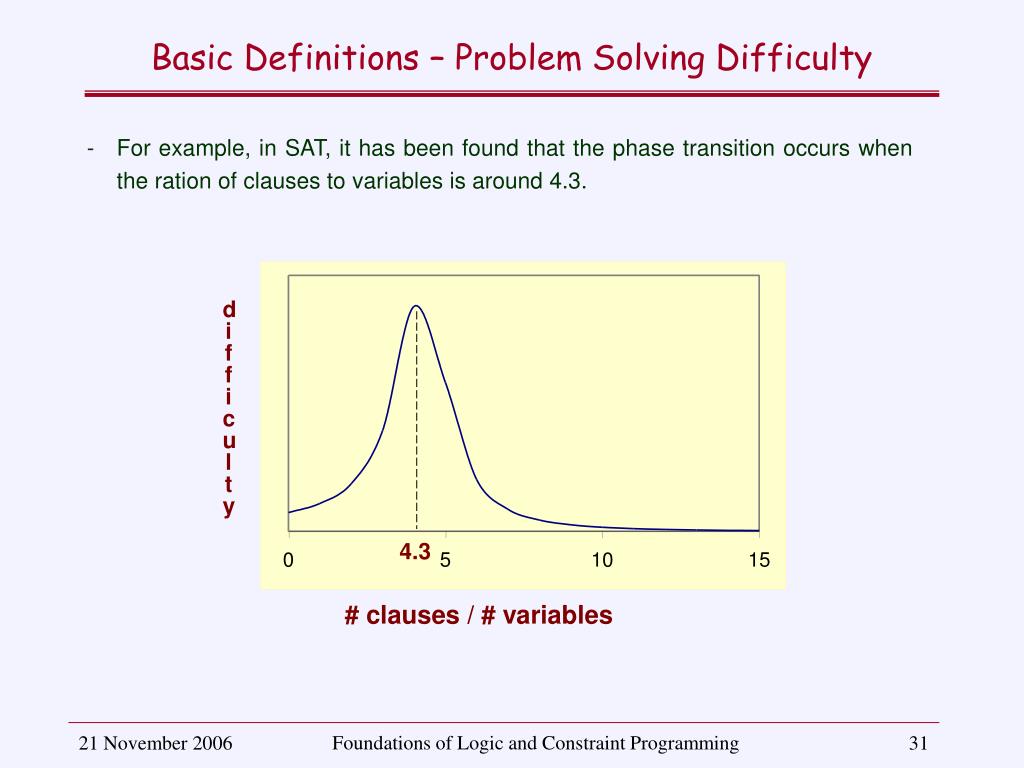 difficulty 4.3 # clauses / # variables Basic Definitions – Problem Solving Difficulty • For example, in SAT, it has been found that the phase transition occurs when the ration of clauses to variables is around 4.3. Foundations of Logic and Constraint Programming