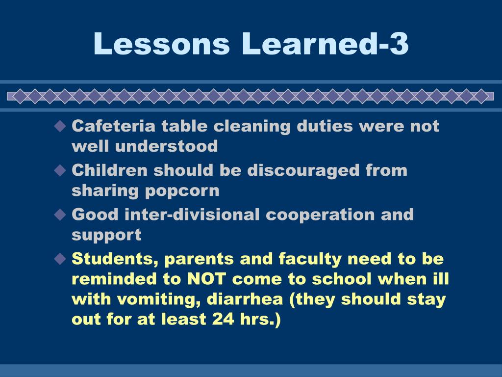 Lessons Learned-3 • Cafeteria table cleaning duties were not well understood • Children should be discouraged from sharing popcorn • Good inter-divisional cooperation and support • Students, parents and faculty need to be reminded to NOT come to school when ill with vomiting, diarrhea (they should stay out for at least 24 hrs.)