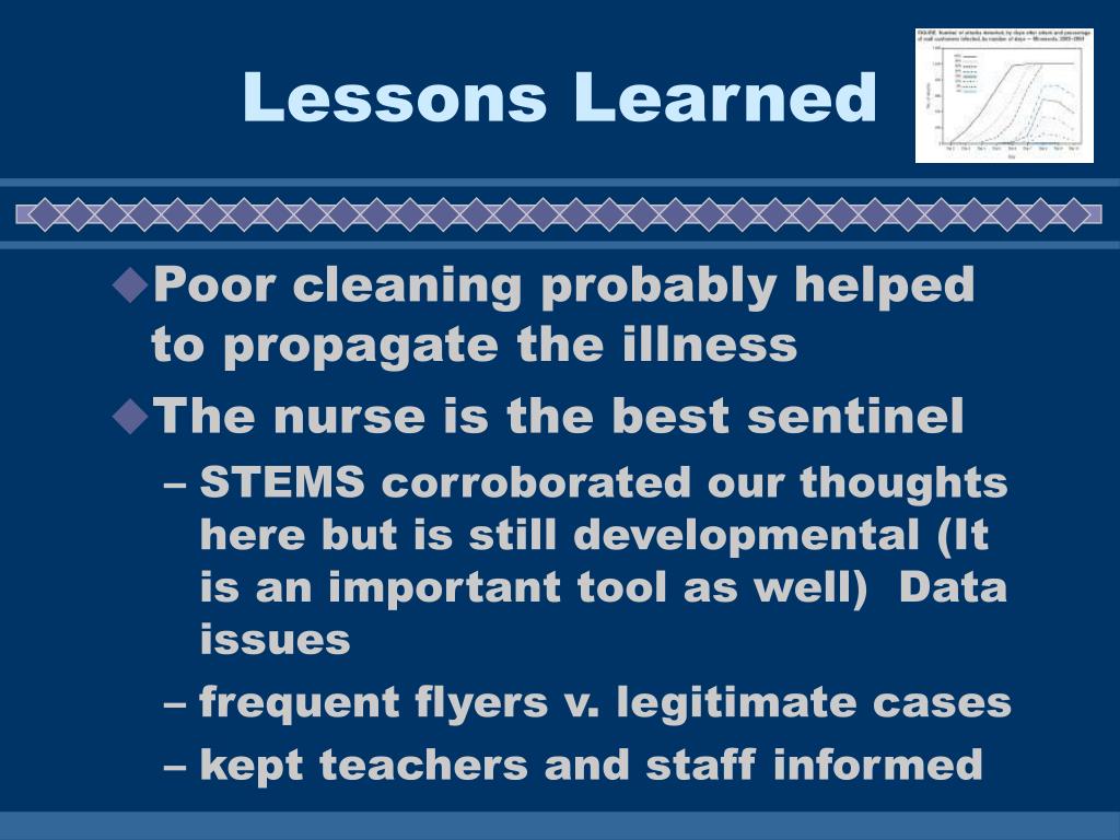 Lessons Learned • Poor cleaning probably helped to propagate the illness • The nurse is the best sentinel • STEMS corroborated our thoughts here but is still developmental (It is an important tool as well) Data issues • frequent flyers v. legitimate cases • kept teachers and staff informed