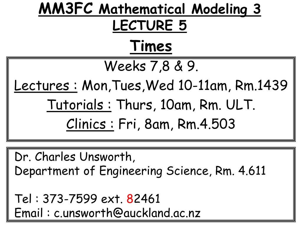 MM3FC Mathematical Modeling 3LECTURE 5 Times Weeks 7,8 & 9. Lectures : Mon,Tues,Wed 10-11am, Rm.1439 Tutorials : Thurs, 10am, Rm. ULT. Clinics : Fri, 8am, Rm.4.503 Dr. Charles Unsworth, Department of Engineering Science, Rm. 4.611 Tel : 373-7599 ext. 82461 Email : c.unsworth@auckland.ac.nz