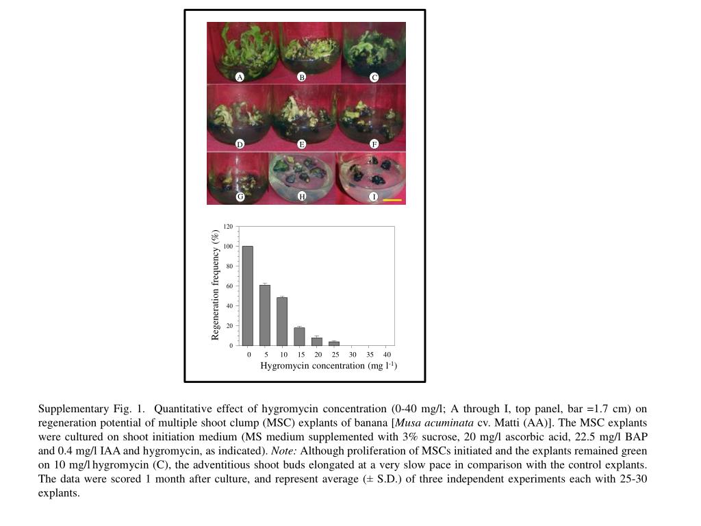 Study on regeneration potential of banana shoot clumps under varied hygromycin concentrations, showcasing slow shoot bud elongation at higher doses. Data confirms stable integration of uidA gene in transgenic bananas.