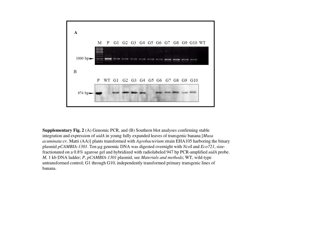 Supplementary Fig. 2 (A) GenomicPCR, and (B) Southern blot analyses confirming stable integration and expression of uidA in young fully expanded leaves of transgenic banana [Musaacuminata cv. Matti (AA)] plants transformed with Agrobacterium strain EHA105 harboring the binary plasmid pCAMBIA-1301. Ten µg genomic DNA was digested overnight with NcoI and Eco721, size-fractionated on a 0.8% agarose gel and hybridized with radiolabeled 947 bp PCR-amplified uidAprobe. M, 1 kb DNA ladder; P, pCAMBIA-1301 plasmid, see Materials and methods; WT, wild-type untransformed control; G1 through G10, independently transformed primary transgenic lines of banana.
