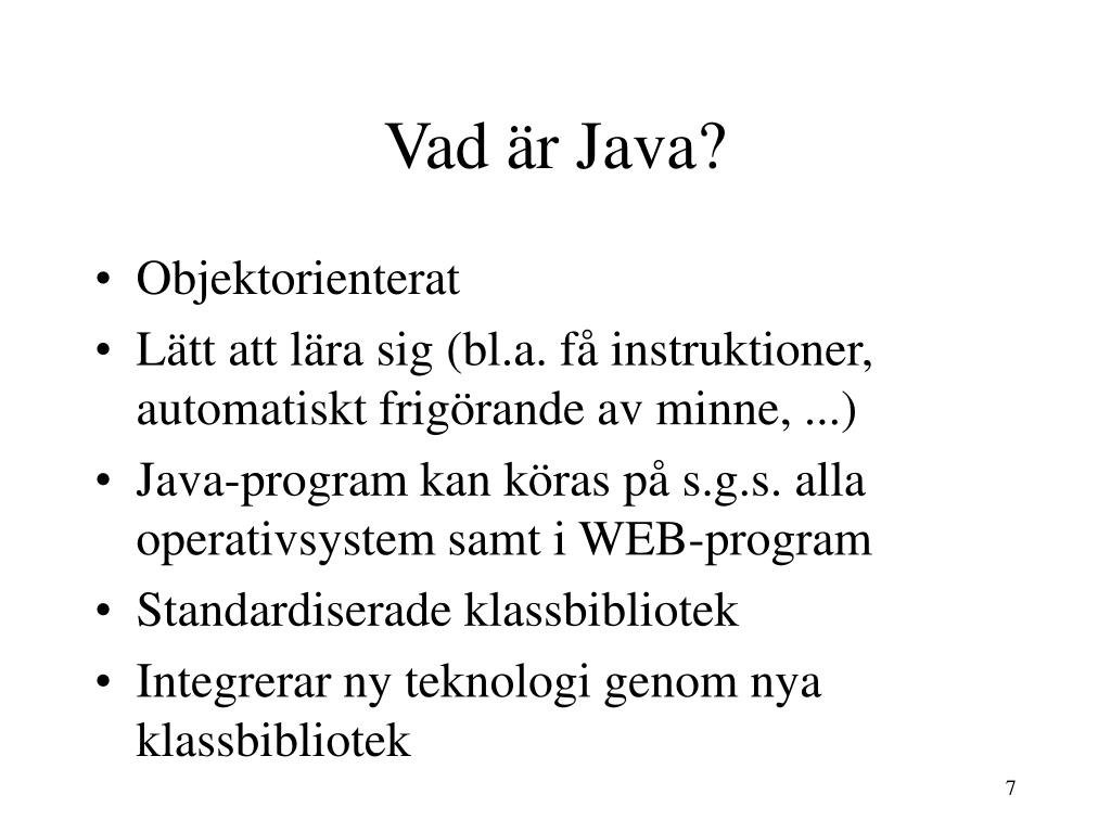 Vad är Java? • Objektorienterat • Lätt att lära sig (bl.a. få instruktioner, automatiskt frigörande av minne, ...) • Java-program kan köras på s.g.s. alla operativsystem samt i WEB-program • Standardiserade klassbibliotek • Integrerar ny teknologi genom nya klassbibliotek