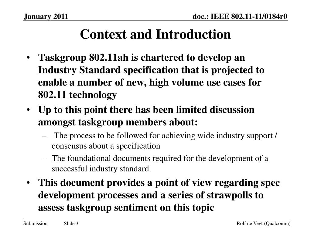 Taskgroup 802.11ah is chartered to develop an Industry Standard specification that is projected to enable a number of new, high volume use cases for 802.11 technology • Up to this point there has been limited discussion amongst taskgroup members about: • The process to be followed for achieving wide industry support / consensus about a specification • The foundational documents required for the development of a successful industry standard • This document provides a point of view regarding spec development processes and a series of strawpolls to assess taskgroup sentiment on this topic Context and Introduction Rolf de Vegt (Qualcomm)