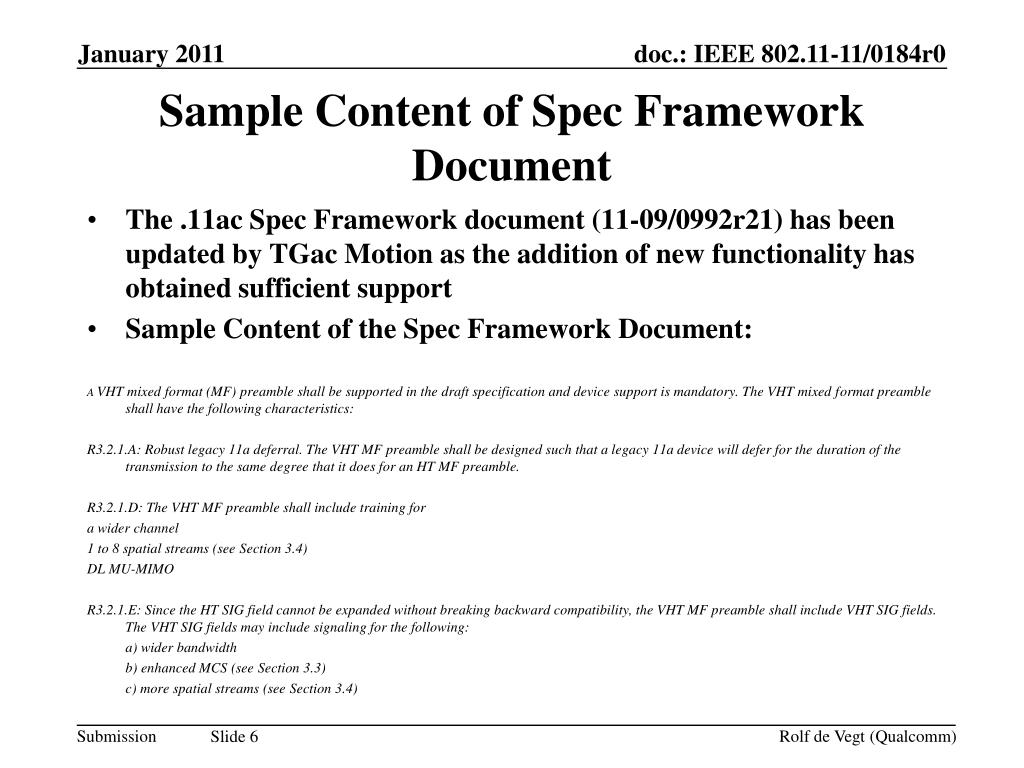 The .11ac Spec Framework document (11-09/0992r21) has been updated by TGac Motion as the addition of new functionality has obtained sufficient support • Sample Content of the Spec Framework Document: A VHT mixed format (MF) preamble shall be supported in the draft specification and device support is mandatory. The VHT mixed format preamble shall have the following characteristics: R3.2.1.A: Robust legacy 11a deferral. The VHT MF preamble shall be designed such that a legacy 11a device will defer for the duration of the transmission to the same degree that it does for an HT MF preamble. R3.2.1.D: The VHT MF preamble shall include training for a wider channel 1 to 8 spatial streams (see Section 3.4) DL MU-MIMO R3.2.1.E: Since the HT SIG field cannot be expanded without breaking backward compatibility, the VHT MF preamble shall include VHT SIG fields. The VHT SIG fields may include signaling for the following: a) wider bandwidth b) enhanced MCS (see Section 3.3) c) more spatial streams (see Section 3.4) Sample Content of Spec Framework Document Rolf de Vegt (Qualcomm)