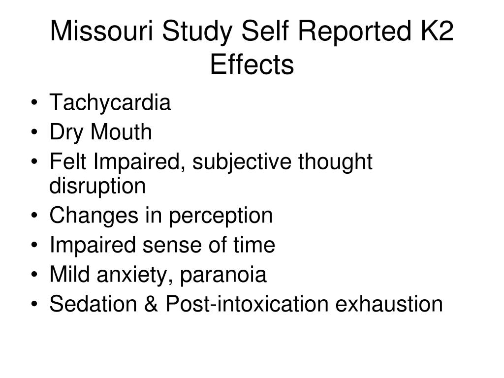 Missouri Study Self Reported K2 Effects • Tachycardia • Dry Mouth • Felt Impaired, subjective thought disruption • Changes in perception • Impaired sense of time • Mild anxiety, paranoia • Sedation & Post-intoxication exhaustion