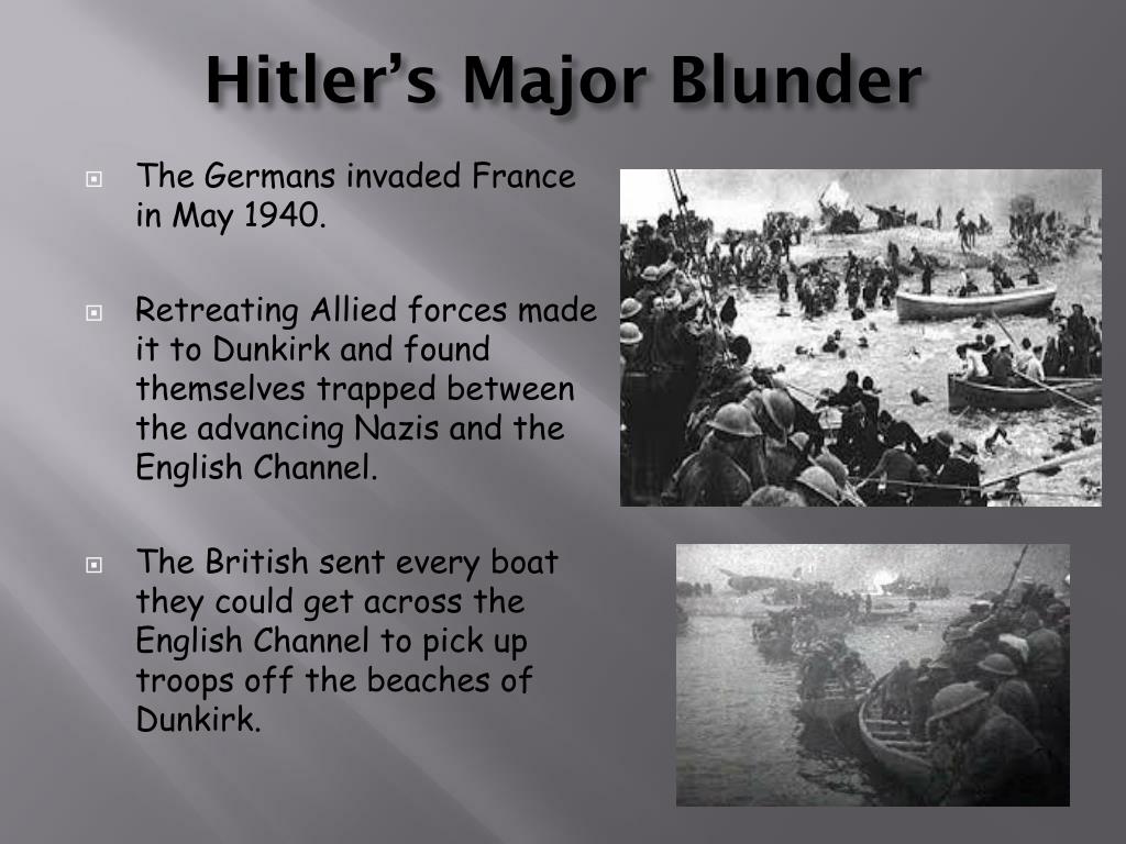 Hitler’s Major Blunder • The Germans invaded France in May 1940. • Retreating Allied forces made it to Dunkirk and found themselves trapped between the advancing Nazis and the English Channel. • The British sent every boat they could get across the English Channel to pick up troops off the beaches of Dunkirk.