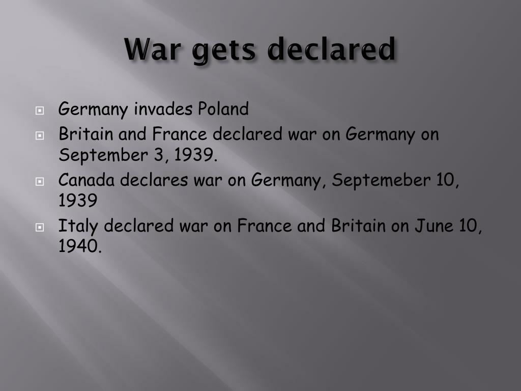 War gets declared • Germany invades Poland • Britain and France declared war on Germany on September 3, 1939. • Canada declares war on Germany, Septemeber 10, 1939 • Italy declared war on France and Britain on June 10, 1940.