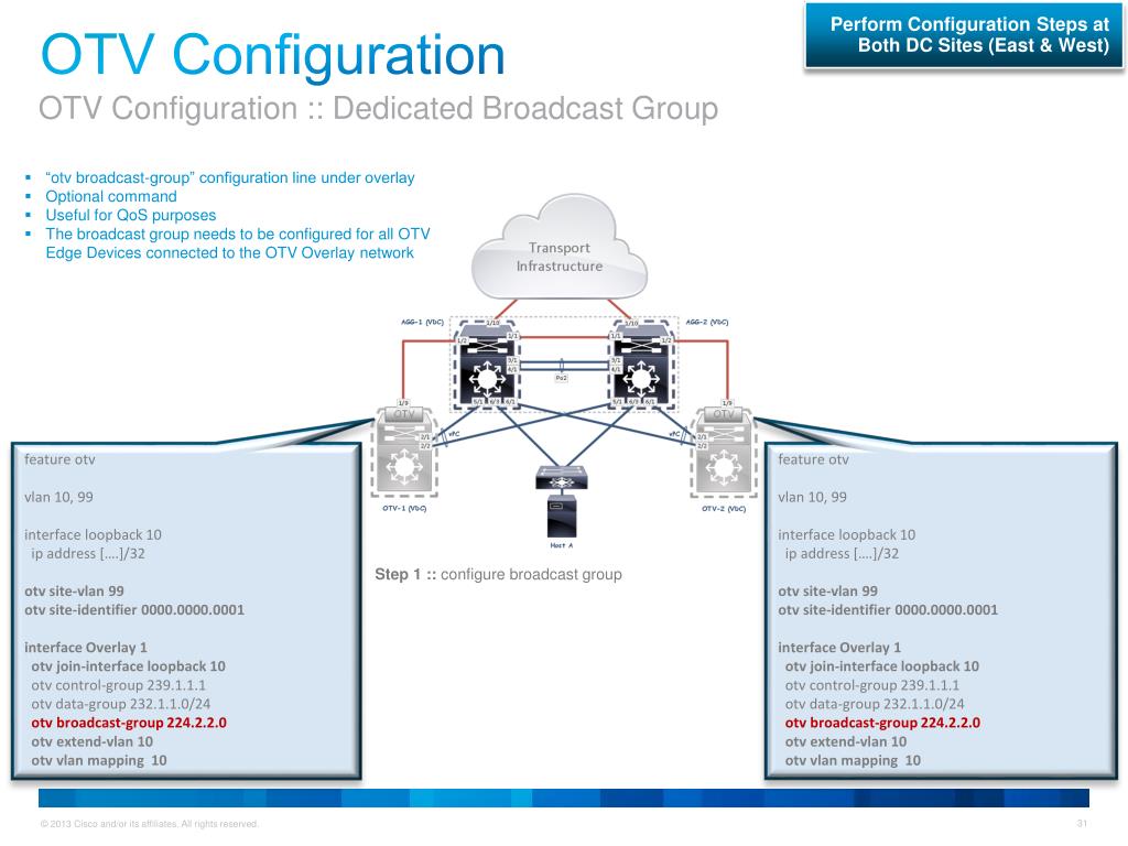 Perform Configuration Steps at Both DC Sites (East & West) Configure OTV :: Enable Required Multicast OTV Configuration Step 1 :: enable PIM Step 2 :: configure PIM sparse mode [AGG VDC] (on all intra & inter data center Layer 3 links) Step 3 :: configure IGMP v3 [AGG & OTV VDC] (join interfaces only) Step 4 :: configure Rendezvous Point (RP) Step 5 :: configure Source-Specific Multicast (SSM) feature ospf feature lacp feature vpc feature pim ippimrp-address [x.x.x.x] group-list 224.0.0.0/4 ippimssm range 232.0.0.0/8 interface e1/1 mtu 9216 ip address [….]/30 ip router ospf 1 area 0.0.0.0 ipospf network point-to-point ippim sparse-mode interface e 1/2 mtu 9216 ipaddress [….] / 30 ip router ospf 1 area 0.0.0.0 ipospf network point-to-point ippim sparse-mode ipigmp version 3 interface e1/10 mtu 9216 ip address [….]/30 ip router ospf 1 area 0.0.0.0 ipospf network point-to-point ippim sparse-mode feature ospf feature lacp feature vpc feature pim ippimrp-address [x.x.x.x] group-list 224.0.0.0/4 ippimssm range 232.0.0.0/8 interface e1/1 mtu 9216 ip address [….]/30 ip router ospf 1 area 0.0.0.0 ipospf network point-to-point ippim sparse-mode interface e 1/2 mtu 9216 ip address [….] / 30 ip router ospf 1 area 0.0.0.0 ipospf network point-to-point ippim sparse-mode ipigmp version 3 interface e1/10 mtu 9216 ip address [….]/30 ip router ospf 1 area 0.0.0.0 ipospf network point-to-point ippimsparse-mode Animation interface e 1/9 mtu 9216 ipaddress [….] / 30 ip router ospf 1 area 0.0.0.0 ipospf network point-to-point ipigmp version 3 interface e 1/9 mtu 9216 ip address [….] / 30 ip router ospf 1 area 0.0.0.0 ipospf network point-to-point ipigmp version 3