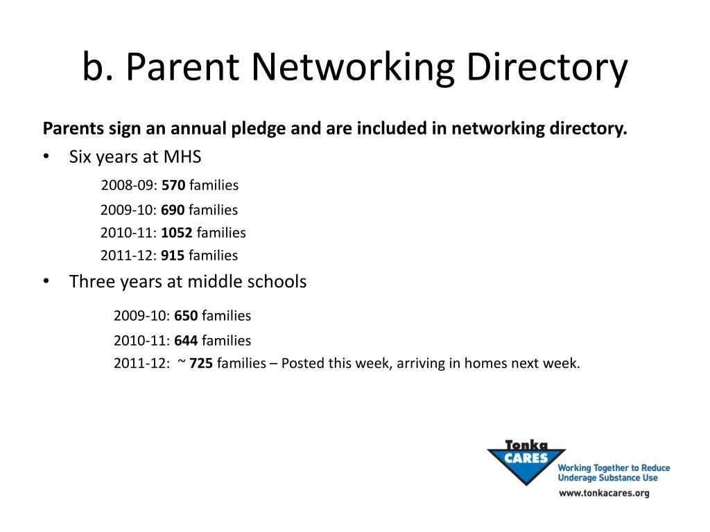 b. Parent Networking Directory Parents sign an annual pledge and are included in networking directory. • Six years at MHS2008-09: 570 families 2009-10: 690 families 2010-11: 1052 families 2011-12: 915 families • Three years at middle schools 2009-10: 650 families 2010-11: 644 families 2011-12: ~ 725 families – Posted this week, arriving in homes next week.