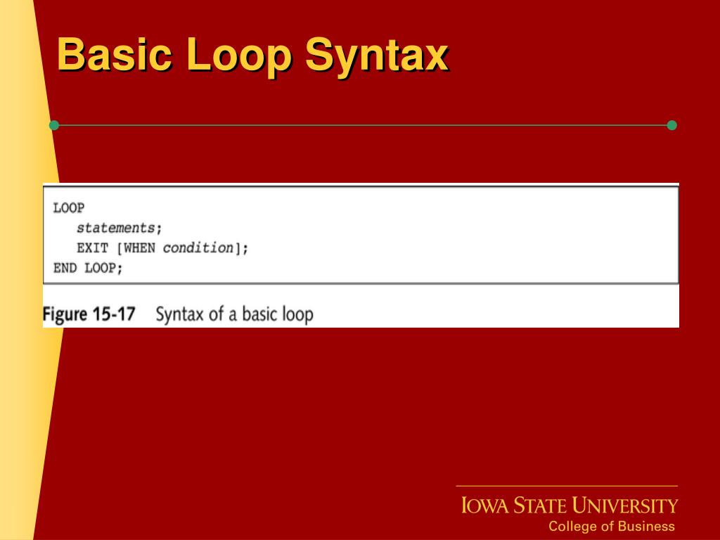 Execution Control • IF statement – executes statements based on a condition • Basic loop – executes statements until condition in EXIT clause is TRUE • FOR loop – uses counter • WHILE loop – executes statements until condition is FALSE