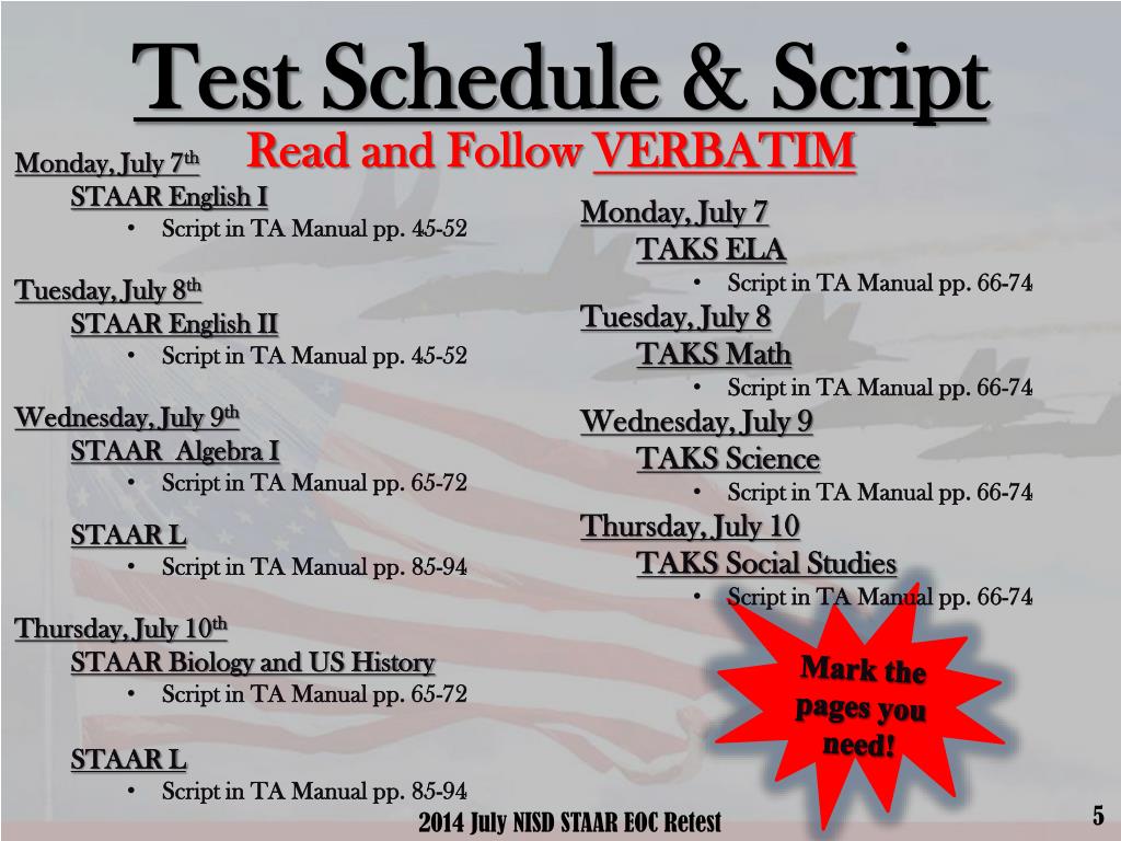 Test Schedule & Script Read and Follow VERBATIM • Monday, July 7th • STAAR English I • Script in TA Manual pp. 45-52 • Tuesday, July 8th • STAAR English II • Script in TA Manual pp. 45-52 • Wednesday, July 9th • STAAR Algebra I • Script in TA Manual pp. 65-72 • STAAR L • Script in TA Manual pp. 85-94 • Thursday, July 10th • STAAR Biology and US History • Script in TA Manual pp. 65-72 • STAAR L • Script in TA Manual pp. 85-94 • Monday, July 7 • TAKS ELA • Script in TA Manual pp. 66-74 • Tuesday, July 8 • TAKS Math • Script in TA Manual pp. 66-74 • Wednesday, July 9 • TAKS Science • Script in TA Manual pp. 66-74 • Thursday, July 10 • TAKS Social Studies • Script in TA Manual pp. 66-74 Mark the pages you need! 2014 July NISD STAAR EOC Retest