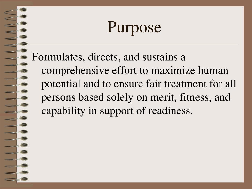Purpose Formulates, directs, and sustains a comprehensive effort to maximize human potential and to ensure fair treatment for all persons based solely on merit, fitness, and capability in support of readiness.
