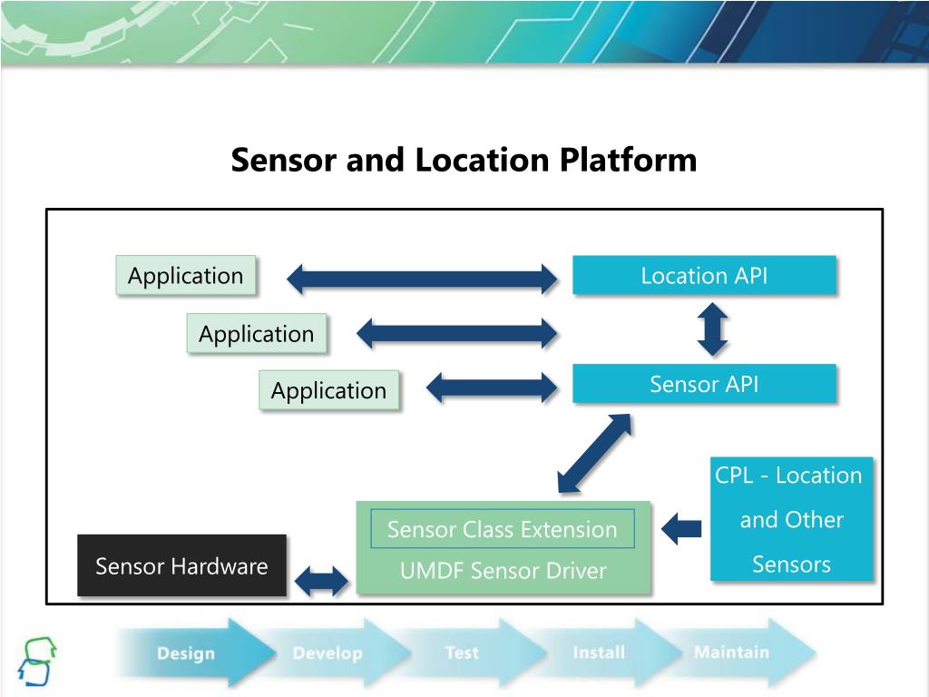 Sensor and Location Platform Application Location API Application Sensor API Application CPL - Location and Other Sensors UMDF Sensor Driver Sensor Class Extension Sensor Hardware