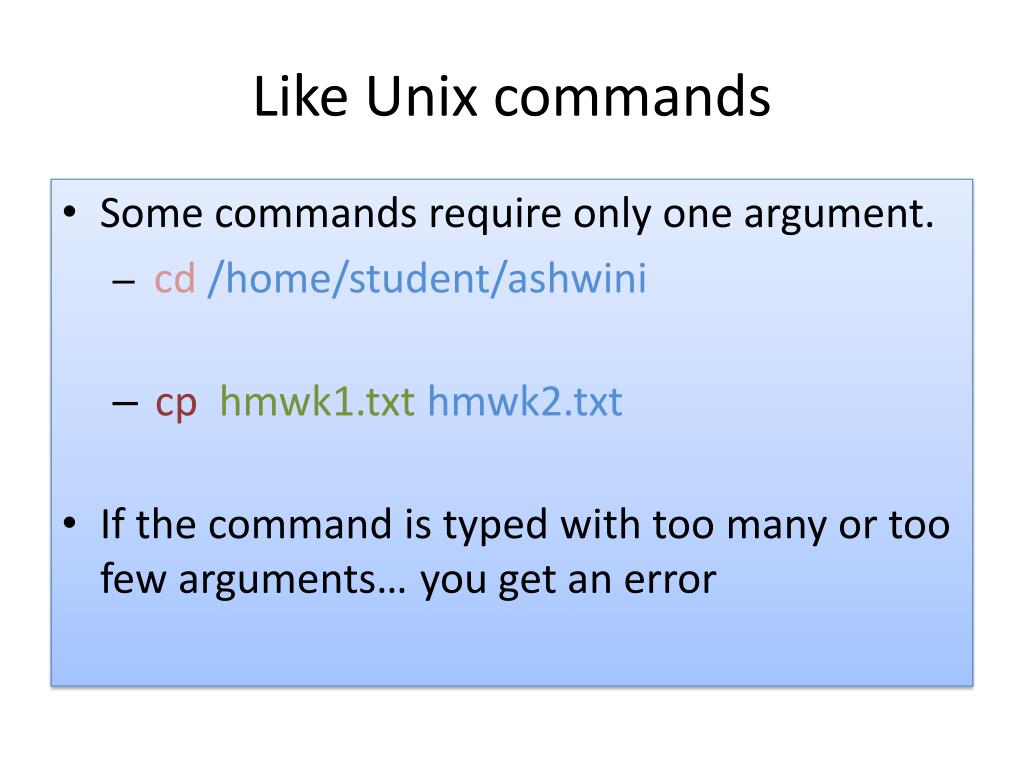 Like Unix commands • Some commands require only one argument. • cd/home/student/ashwini • cphmwk1.txthmwk2.txt • If the command is typed with too many or too few arguments… you get an error