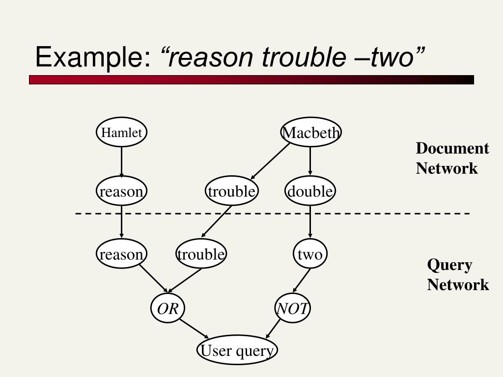 Example: “reason trouble –two” Hamlet Macbeth Document Network reason trouble double reason trouble two Query Network OR NOT User query