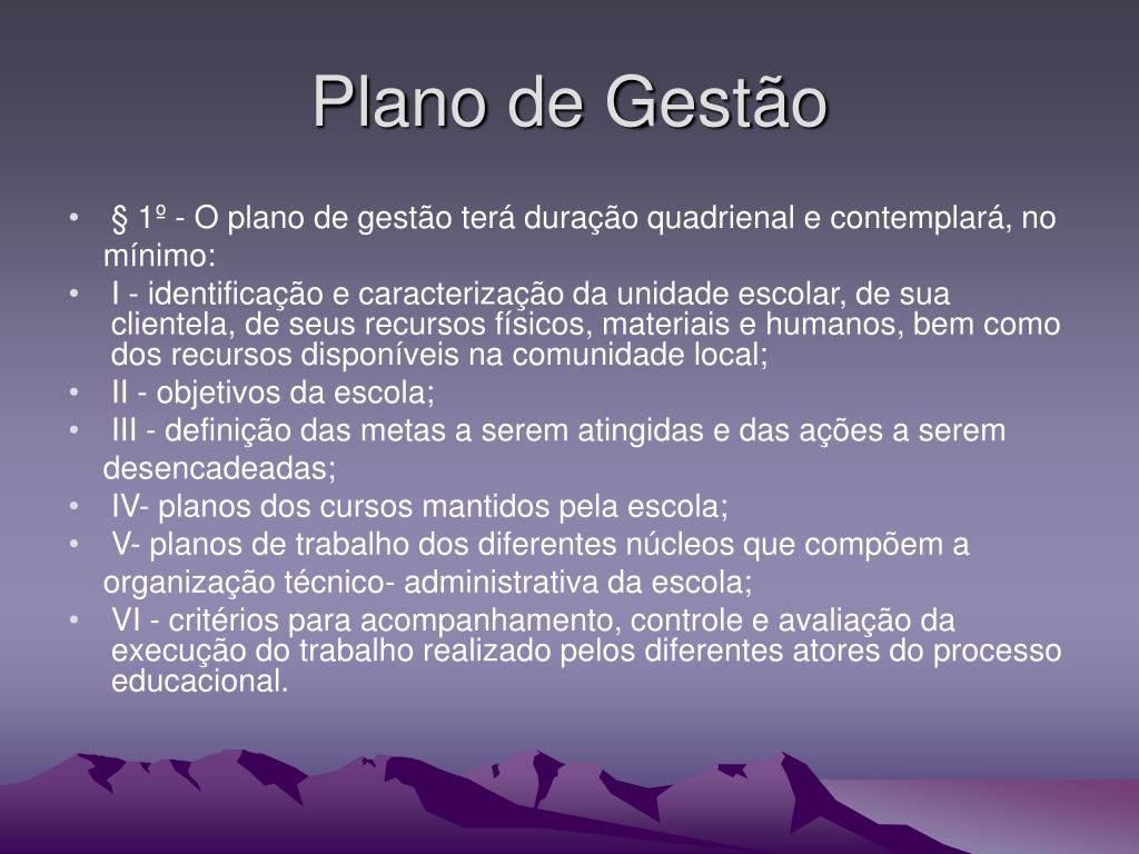 Plano de Gestão • § 1º - O plano de gestão terá duração quadrienal e contemplará, no mínimo: • I - identificação e caracterização da unidade escolar, de sua clientela, de seus recursos físicos, materiais e humanos, bem como dos recursos disponíveis na comunidade local; • II - objetivos da escola; • III - definição das metas a serem atingidas e das ações a serem desencadeadas; • IV- planos dos cursos mantidos pela escola; • V- planos de trabalho dos diferentes núcleos que compõem a organização técnico- administrativa da escola; • VI - critérios para acompanhamento, controle e avaliação da execução do trabalho realizado pelos diferentes atores do processo educacional.