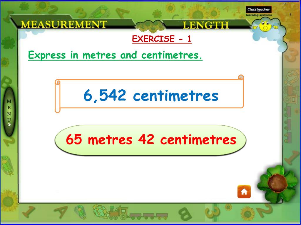 EXERCISE - 1 Express in metres and centimetres. 245 centimetres 800 centimetres 905 centimetres 1,008 centimetres 6,542 centimetres 10 metres 8 centimetres 65 metres 42 centimetres 2 metres 45 centimetres 9 metres 5 centimetres 8 metres