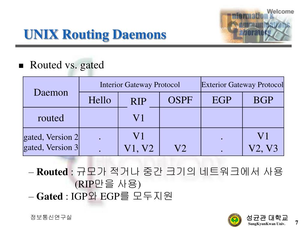 Daemon Interior Gateway Protocol Exterior Gateway Protocol Hello OSPF EGP BGP RIP routed V1 gated, Version 2 gated, Version 3 . . V1 V1, V2 V2 . . V1 V2, V3 UNIX Routing Daemons • Routed vs. gated • Routed : 규모가 적거나 중간 크기의 네트워크에서 사용 • (RIP만을 사용) • Gated : IGP와 EGP를 모두지원 정보통신연구실