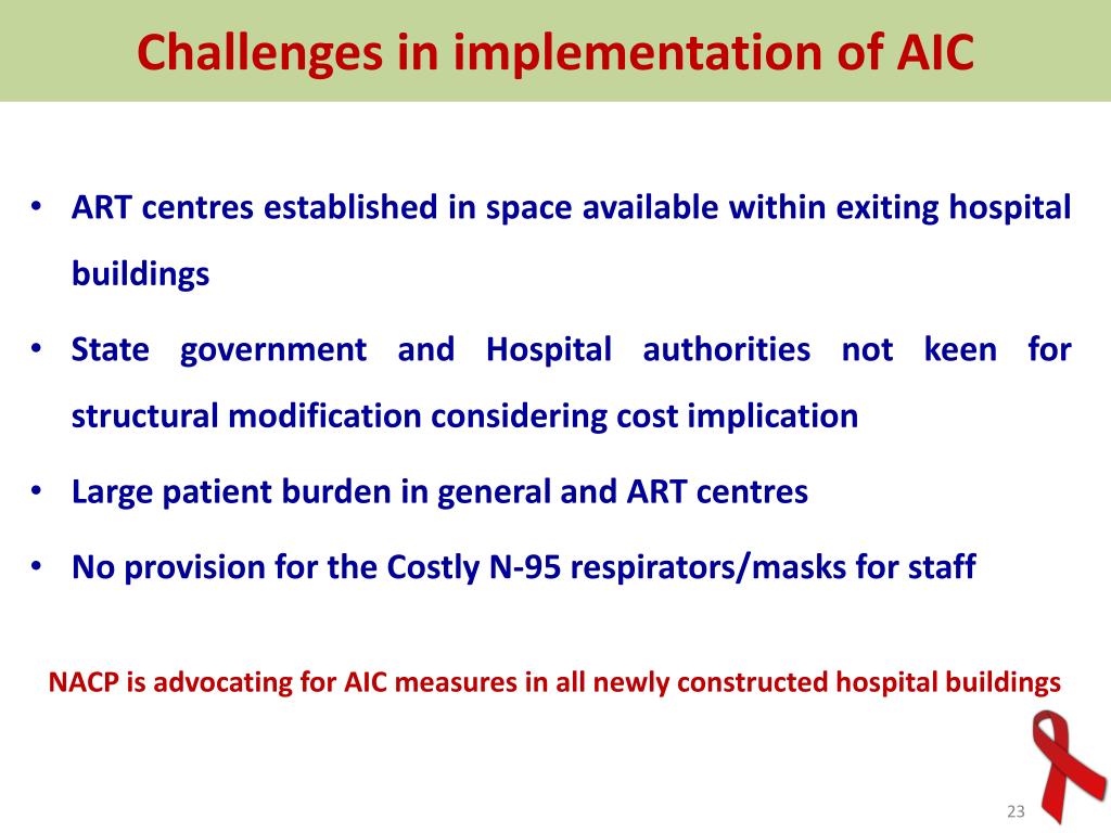 Challenges in implementation of AIC • ART centres established in space available within exiting hospital buildings • State government and Hospital authorities not keen for structural modification considering cost implication • Large patient burden in general and ART centres • No provision for the Costly N-95 respirators/masks for staff NACP is advocating for AIC measures in all newly constructed hospital buildings