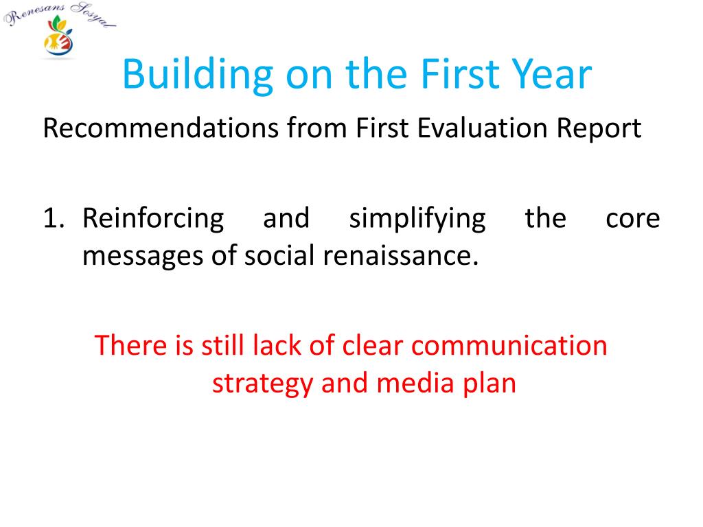 Building on the First Year Recommendations from First Evaluation Report • Reinforcing and simplifying the core messages of social renaissance. There is still lack of clear communication strategy and media plan