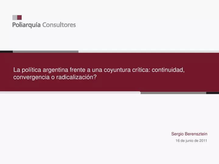 La política argentina frente a una coyuntura crítica: continuidad, convergencia o radicalización? Sergio Berensztein 16 de junio de 2011