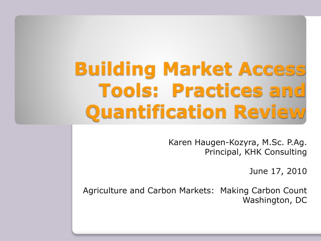 Building Market Access Tools: Practices and Quantification Review Karen Haugen-Kozyra, M.Sc. P.Ag. Principal, KHK Consulting June 17, 2010 Agriculture and Carbon Markets: Making Carbon Count Washington, DC