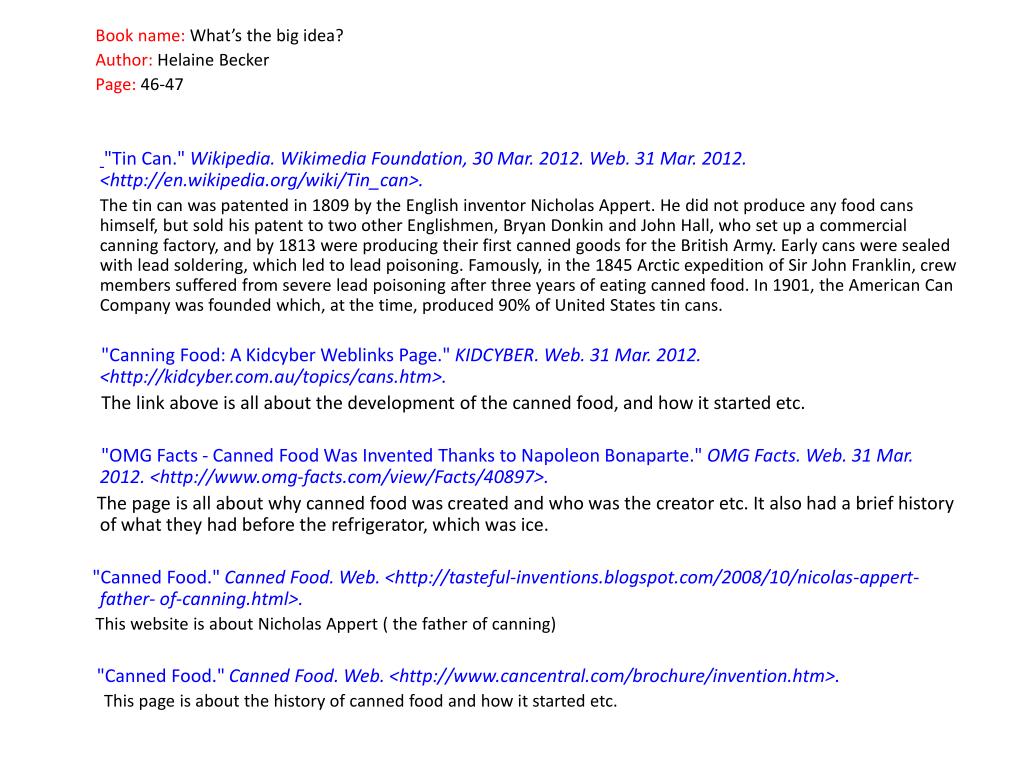 Book name: What’s the big idea? Author: Helaine Becker Page: 46-47 "Tin Can." Wikipedia. Wikimedia Foundation, 30 Mar. 2012. Web. 31 Mar. 2012. <http://en.wikipedia.org/wiki/Tin_can>. The tin can was patented in 1809 by the English inventor Nicholas Appert. He did not produce any food cans himself, but sold his patent to two other Englishmen, Bryan Donkin and John Hall, who set up a commercial canning factory, and by 1813 were producing their first canned goods for the British Army. Early cans were sealed with lead soldering, which led to lead poisoning. Famously, in the 1845 Arctic expedition of Sir John Franklin, crew members suffered from severe lead poisoning after three years of eating canned food. In 1901, the American Can Company was founded which, at the time, produced 90% of United States tin cans. "Canning Food: A KidcyberWeblinks Page." KIDCYBER. Web. 31 Mar. 2012. <http://kidcyber.com.au/topics/cans.htm>. The link above is all about the development of the canned food, and how it started etc. "OMG Facts - Canned Food Was Invented Thanks to Napoleon Bonaparte." OMG Facts. Web. 31 Mar. 2012. <http://www.omg-facts.com/view/Facts/40897>. The page is all about why canned food was created and who was the creator etc. It also had a brief history of what they had before the refrigerator, which was ice. "Canned Food." Canned Food. Web. <http://tasteful-inventions.blogspot.com/2008/10/nicolas-appert-father- of-canning.html>. This website is about Nicholas Appert ( the father of canning) "Canned Food." Canned Food. Web. <http://www.cancentral.com/brochure/invention.htm>. This page is about the history of canned food and how it started etc.