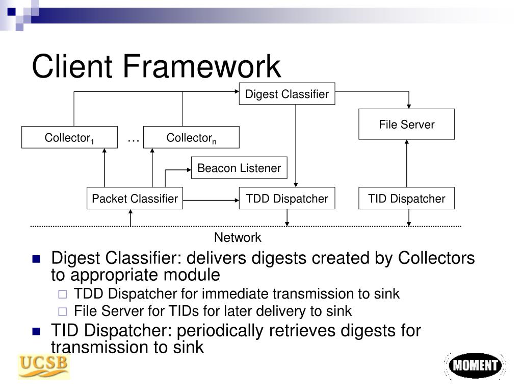 Client Framework Digest Classifier File Server • Digest Classifier: delivers digests created by Collectors to appropriate module • TDD Dispatcher for immediate transmission to sink • File Server for TIDs for later delivery to sink • TID Dispatcher: periodically retrieves digests for transmission to sink Collector1 … Collectorn Beacon Listener Packet Classifier TDD Dispatcher TID Dispatcher Network