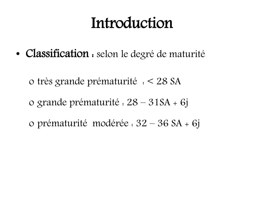 Introduction • Classification : selon le degré de maturité • très grande prématurité : < 28 SA • grande prématurité : 28 – 31SA + 6j • prématurité modérée : 32 – 36 SA + 6j