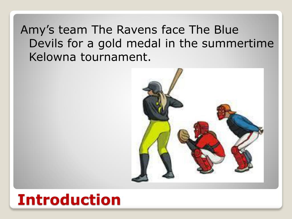 The Ravens . By: Ryann West. Amy’s team T he Ravens face The Blue Devils for a gold medal in the summertime Kelowna tournament. . Introduction. Center fielder Skyler goes for a pop fly and knocks into Left fielder and brakes Skylers leg. Inciting Incident.