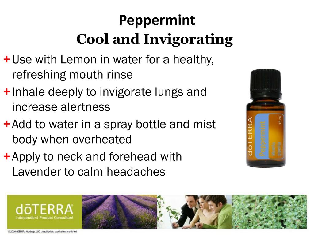 Peppermint Cool and Invigorating • Use with Lemon in water for a healthy, refreshing mouth rinse • Inhale deeply to invigorate lungs and increase alertness • Add to water in a spray bottle and mist body when overheated • Apply to neck and forehead with Lavender to calm headaches